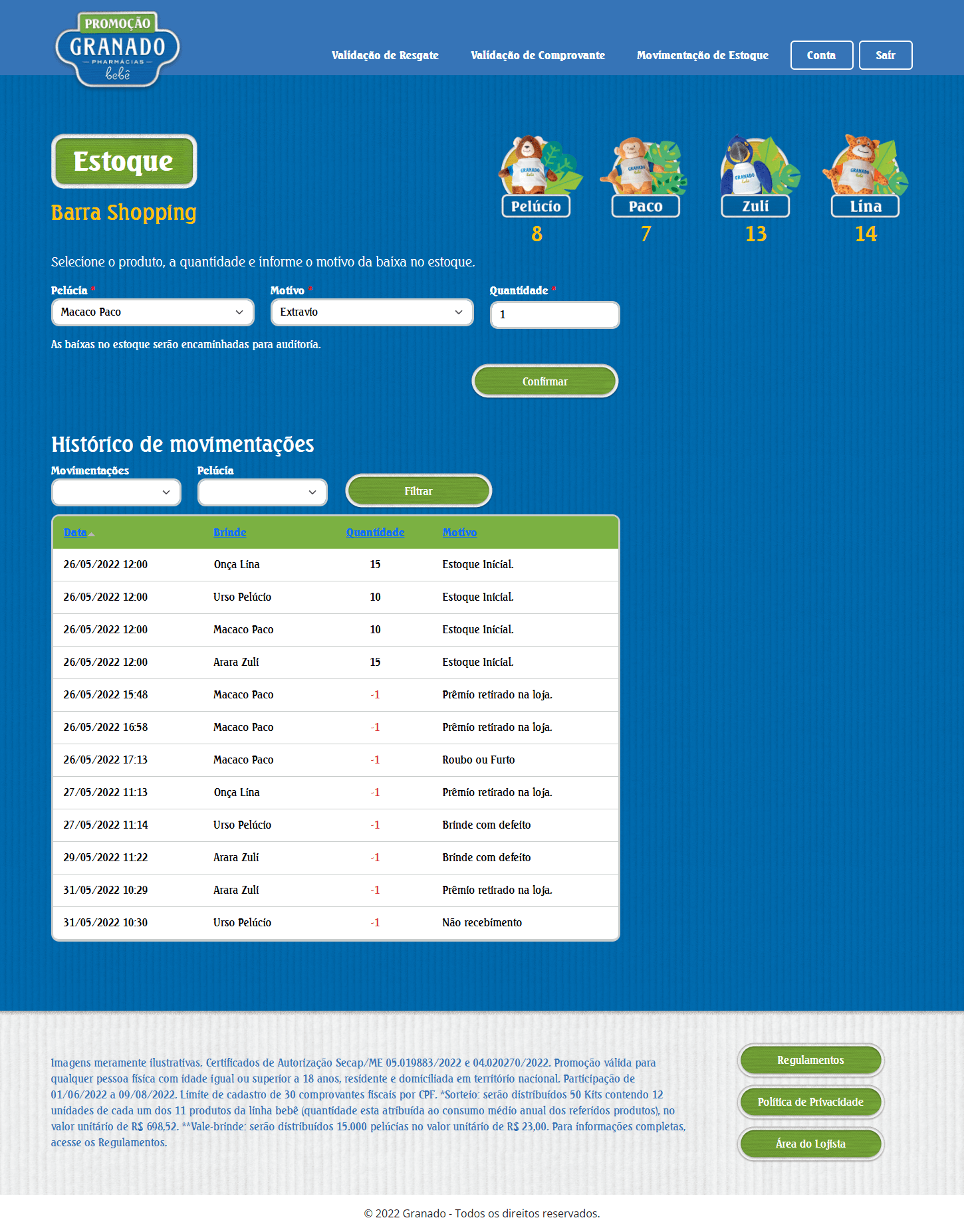 • Transferência de Estoque: Através do painel, o cliente podia gerenciar a movimentação de estoques entre postos de troca, antecipando-se à demanda e garantindo que nenhuma loja ficasse sem brindes enquanto a campanha estivesse ativa.
