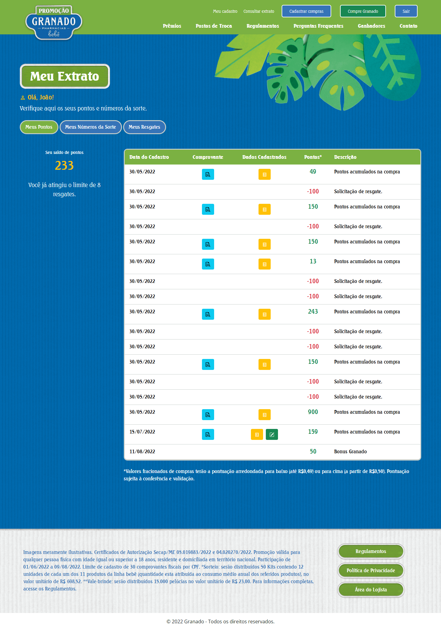 Criamos uma área do participante intuitiva onde o cliente cadastrava suas notas, via seu saldo de pontos crescer e podia escolher qual pelúcia resgatar, verificando a disponibilidade.
